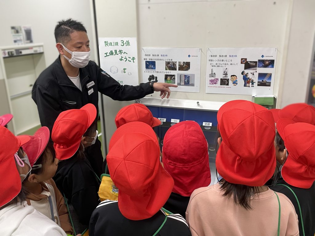 Third grade students from a local elementary school came to NATSUME OPTICAL CORPORATION for a factory tour. They were studying what is made in a factory and how it is used for their social studies class assignment entitled “Work in a Factory”.